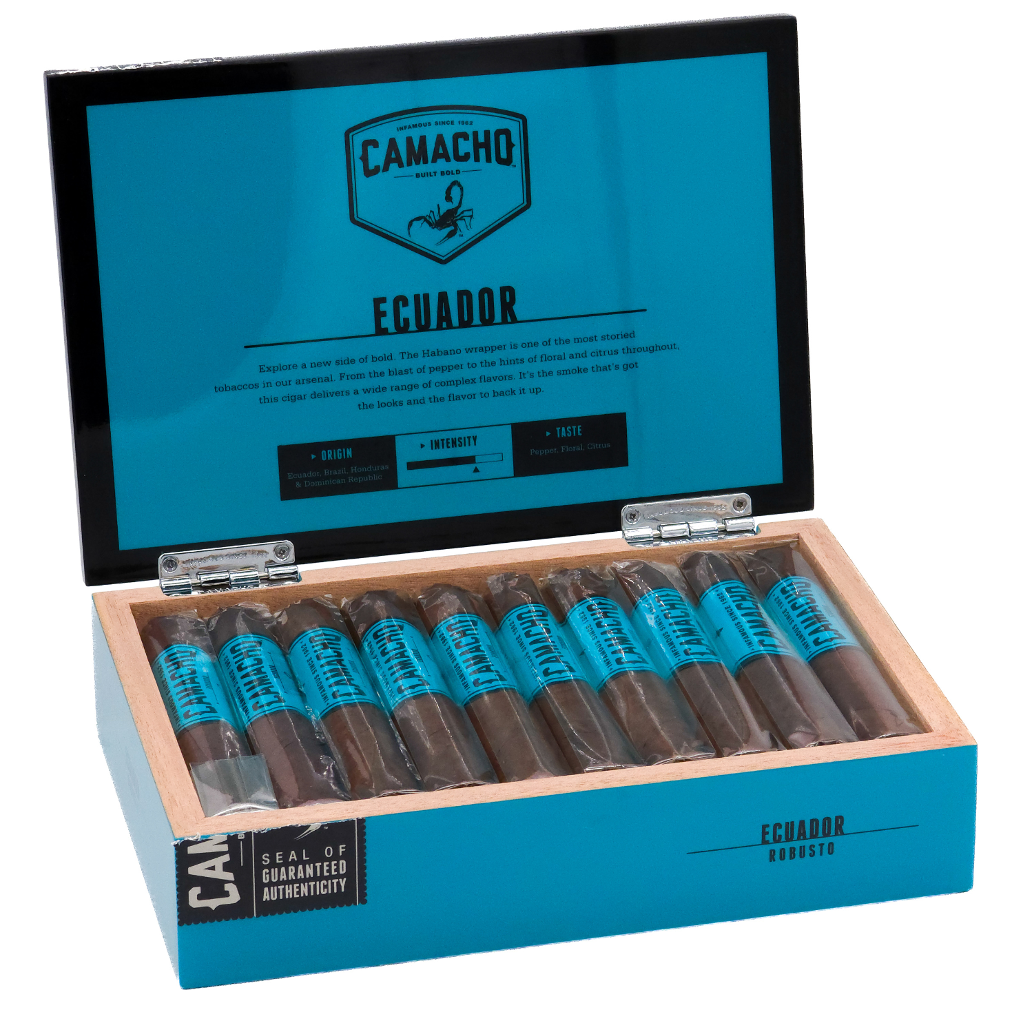 Camacho Ecuador‘s bold blend surprises your palate with complex flavours of wood, earth, and spice but also with some sweet, creamy and nutty flavours. Peppery and floral as well as citric notes round up the smoke.