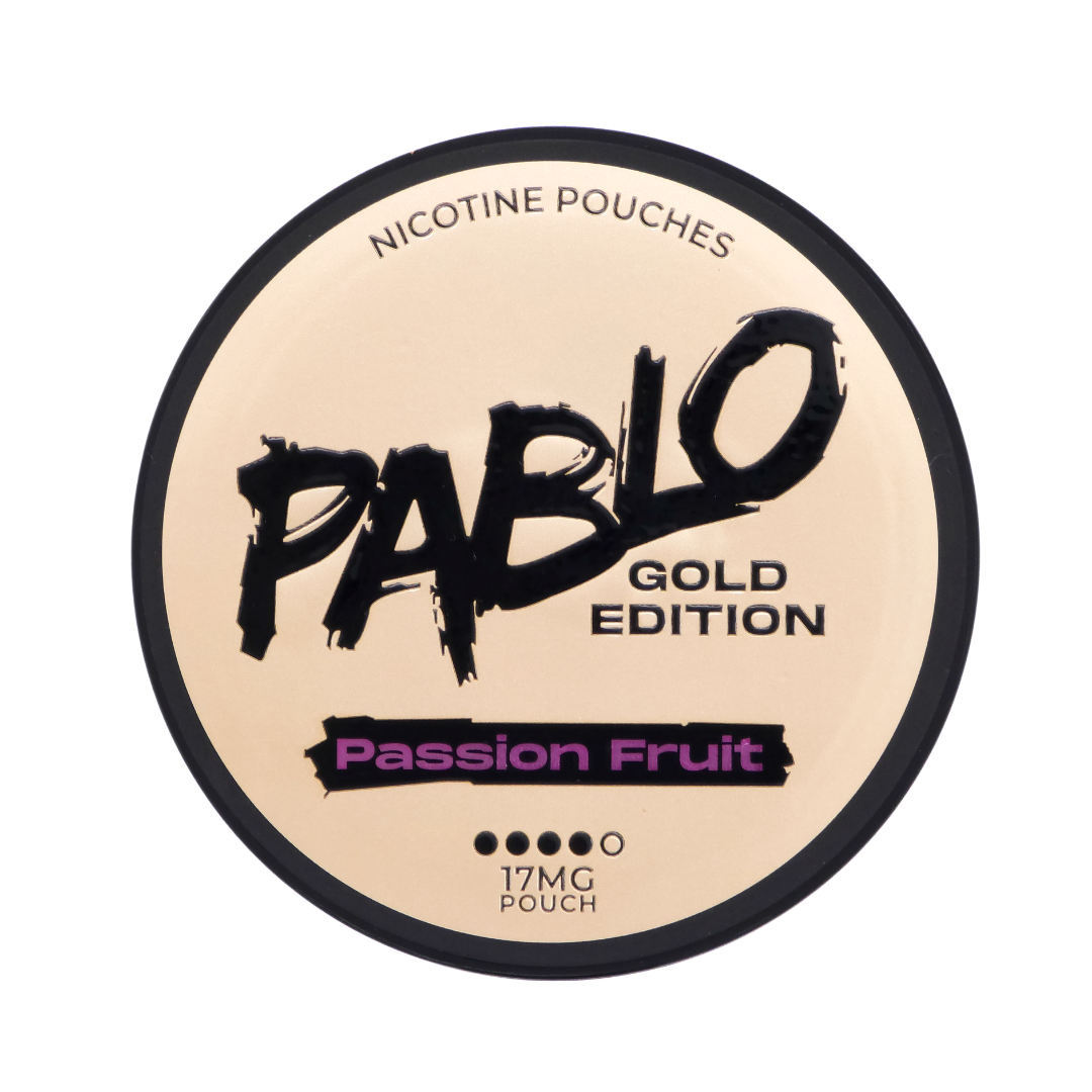 Pablo Gold Edition Passion Fruit 17 mg nicotine pouches deliver vibrant passion fruit flavour with a moderate nicotine strength for a smooth and balanced profile. The mini pouch format sits comfortably under the lip while providing consistent nicotine release and steady flavour.