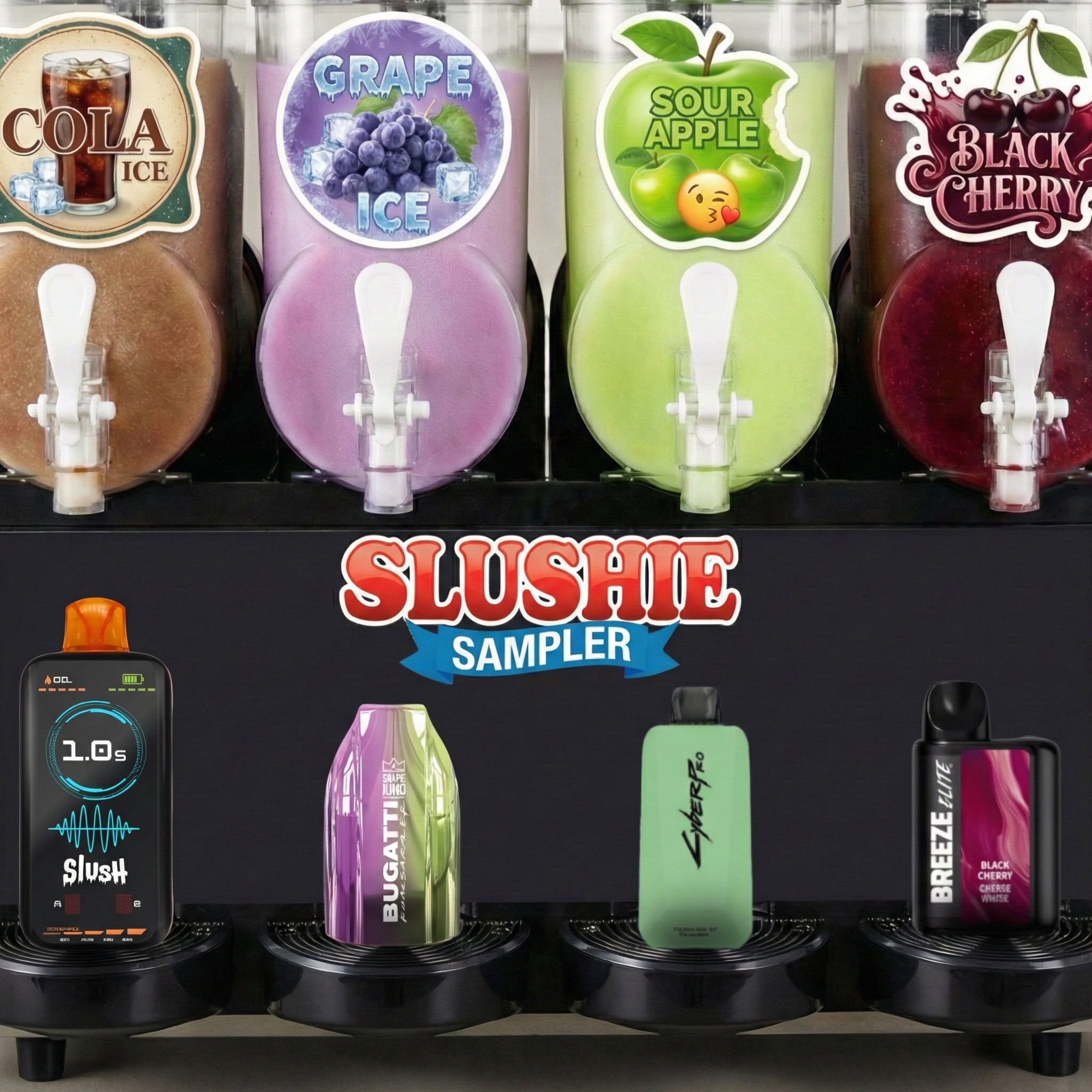 The Slushie Sampler is built around flavours that feel right at home spinning in a frozen drink machine. Sweet, bold, and refreshingly smooth, this mixed brand lineup pulls from classic slushie staples like cola, grape, apple, and cherry. Each flavour hits with that icy, drinkable vibe that makes slushies impossible to put down, perfect for rotating through cool, familiar favourites.