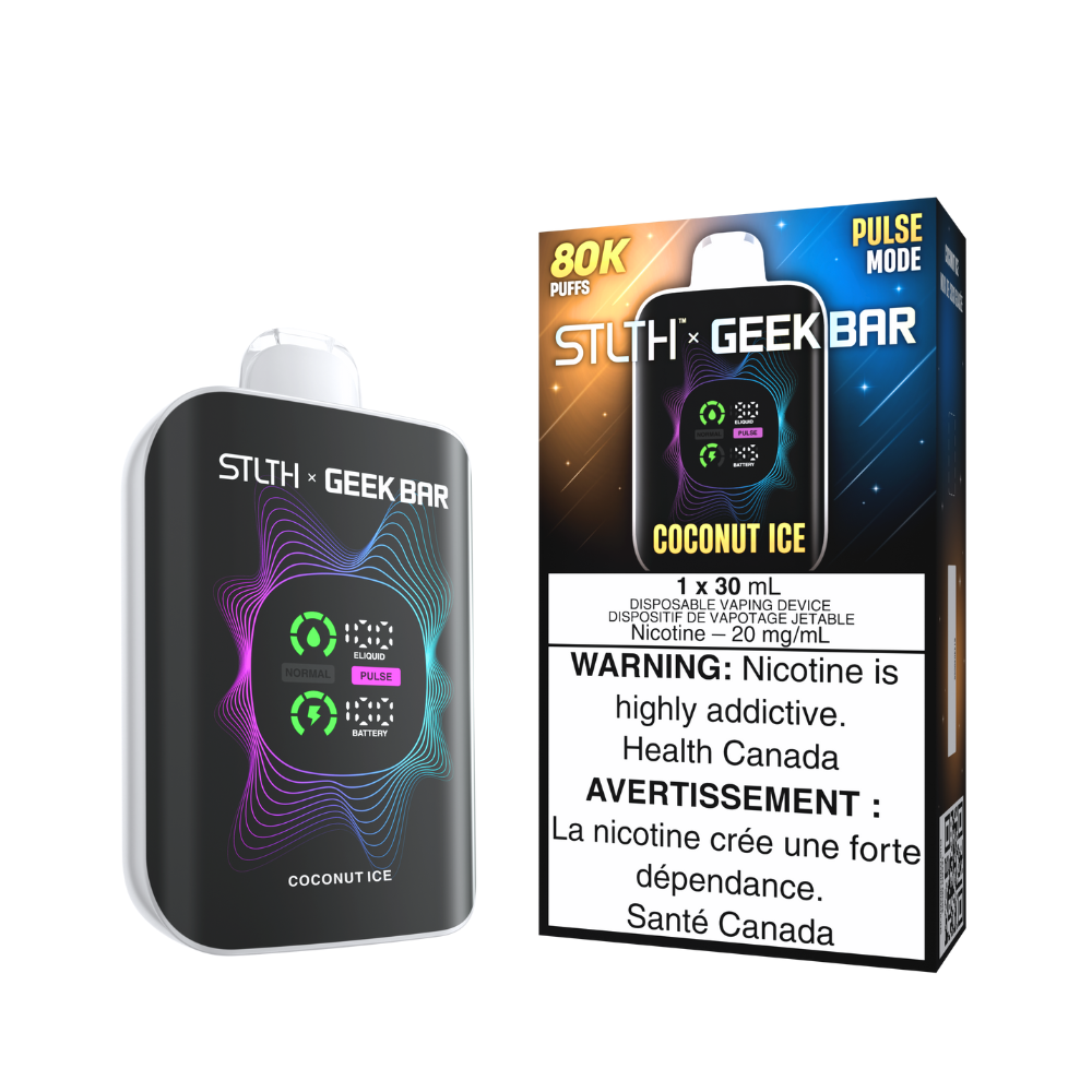 The STLTH x Geek Bar 80K Coconut Ice blends creamy coconut flavour with a cool icy finish inside one of the longest lasting disposables in Canada. Designed for everyday performance, this device pairs STLTH build quality with Geek Bar technology to deliver smooth flavour, big capacity and long running power. Each device is filled with 30 mL of e liquid and offers up to 80,000 puffs so you can vape longer without switching out your setup.